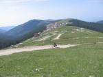 Jak to powiedzieć, że pomimo wspaniałej pogody, dobrego ekwipunku czuć jednak w tym miejscu jakiś strach przed potęgą tych gór. Człowiek zachwyca się tymi widokami lecz podświadomie dąży do tego aby uciec stąd jak najszybciej. Strach przed górami, nie ma się czego wstydzić. Tutaj czuć jaką kruszyną jest człowiek wobec majestatu gór. Wystarczy załamanie pogody i robi sie problem. Nie ma jak szybko uciec. Góry stwarzają barierę nie do przebycia. Dotarcie tutaj nie było łatwe, co by było gdyby warunki były inne. Zjazd jest nieprzyjemny, ogromne i luźne kamienie nie ułatwiają zadania. Momentami bardzo stromo. Rowery objuczone sakwami nie zachowuję się najlepiej w takich warunkach. Mijamy dwóch Rumunów na rowerach. Ich ekwipunek to makrokeszowe fulle z przykręconymi do sztycy koszykami. W koszykach luzem leżą bagaże. Nie dziwi fakt, że z takim ekwipunkiem chłopaki muszą prowadzić rowery. Aż żal myśleć kiedy dojadą do celu.